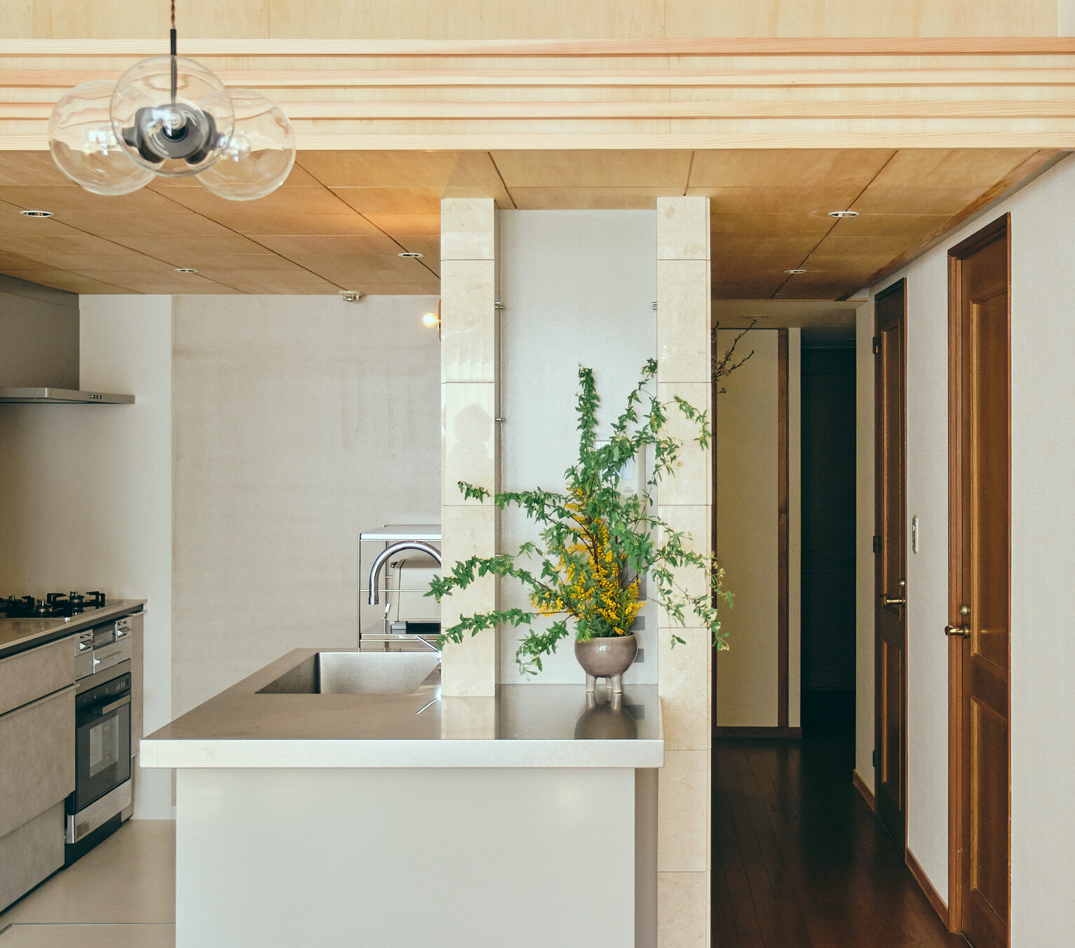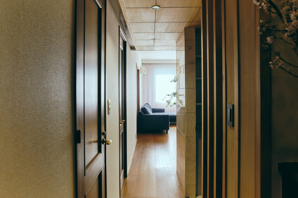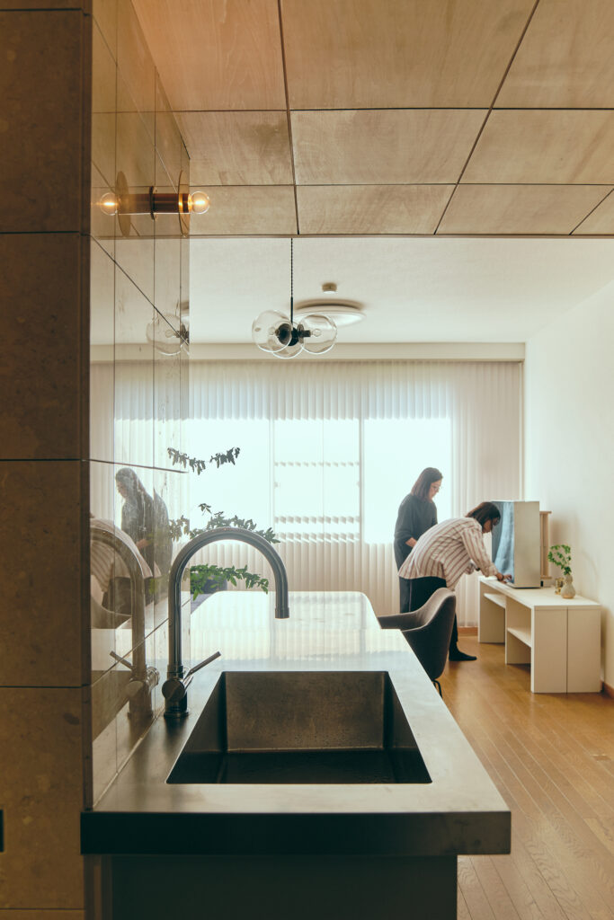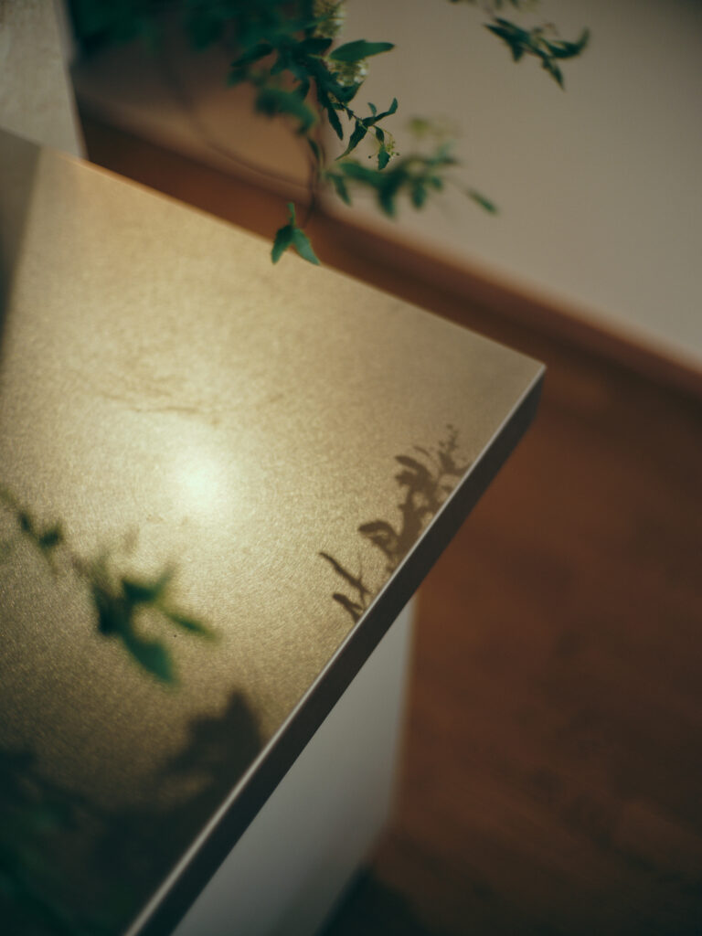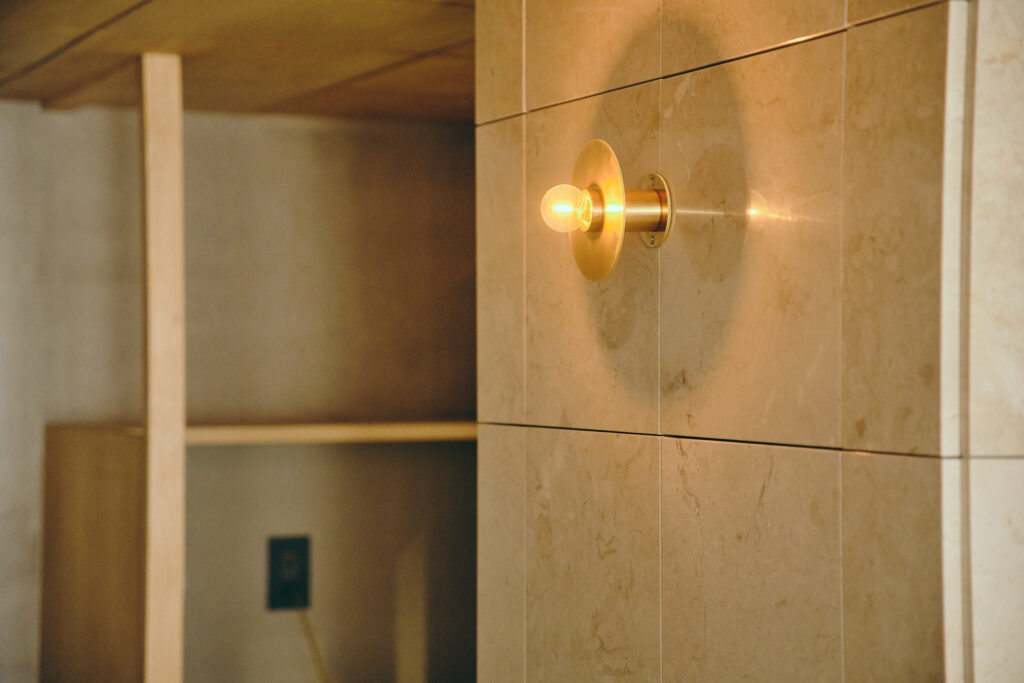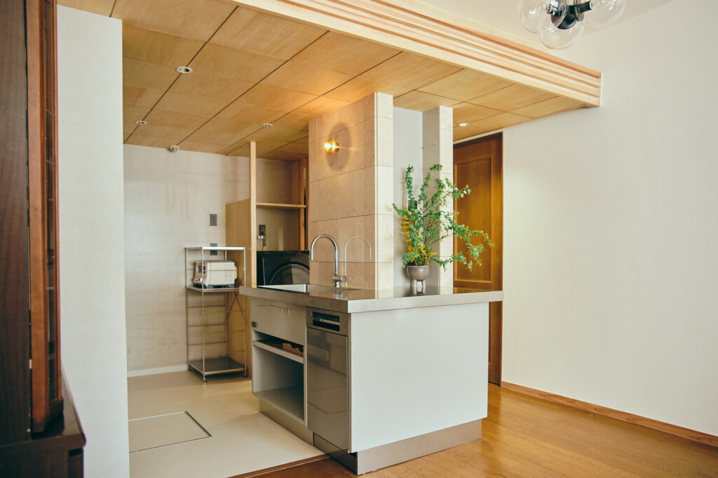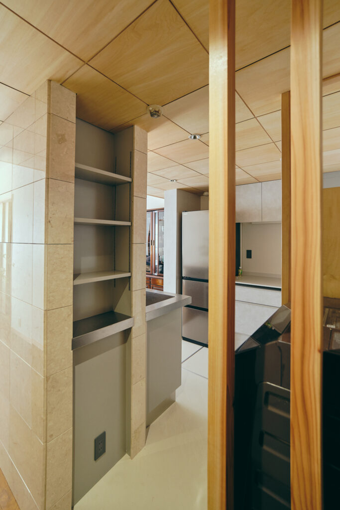 マンション全体は、バブル期らしく装飾性のある設えで、真鍮や大理石が用いられていた。そうした文脈に添い、コーラルの石やステンレス、木ルーバーや和紙、タイルといった、ちょっとした強さを持つ素材を、少しずつ挿入して空間を使った。結果時に、陰影のある路地のような空間が生まれ、部分改修でありながら、部屋全体の印象が更新された。