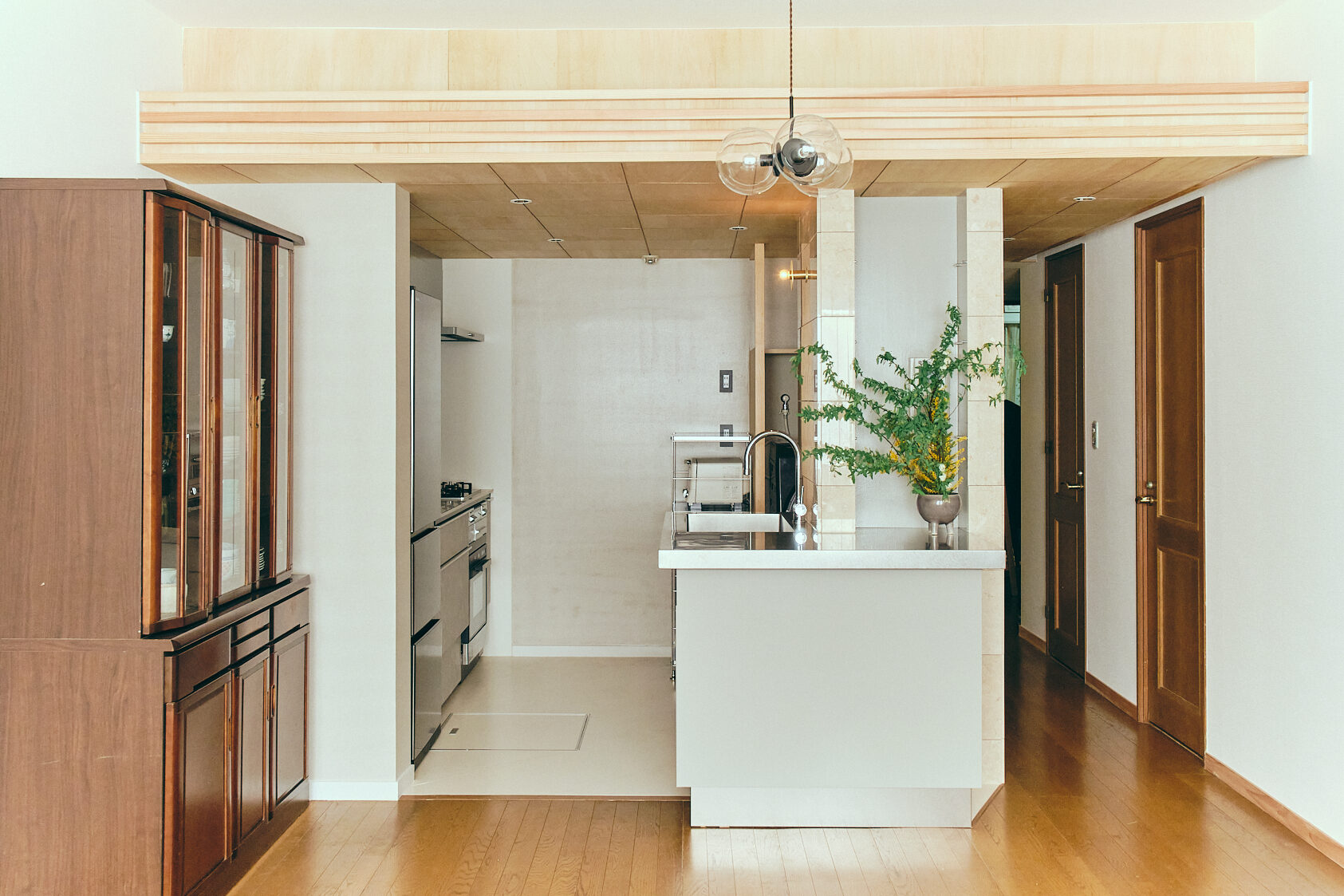 南北に伸びた平面プランで、南側には緑が見える窓があった。ここから入る光を、なるべく部屋の奥まで、もちろんキッチンにも、通すことを考え、シンク、コンロ、家電、洗濯機、などの家事要素を、小さく分散させることにした。