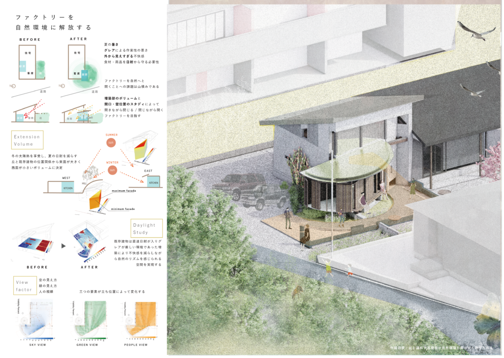 製造所は朝早くから稼働するため、朝の光を室内に取り入れられるよう、既存建物に対して3 0 度振られた3 / 4 円のジオメトリーを採⽤した。働く⼈は⾃然を感じながら、地域の⾵を感じながら働く。 客席環境はファクトリーの外壁が外部の⾃然との間のバッファーとして機能し、貫⼊する天井はライトシェルフとして柔らかい光を届ける。