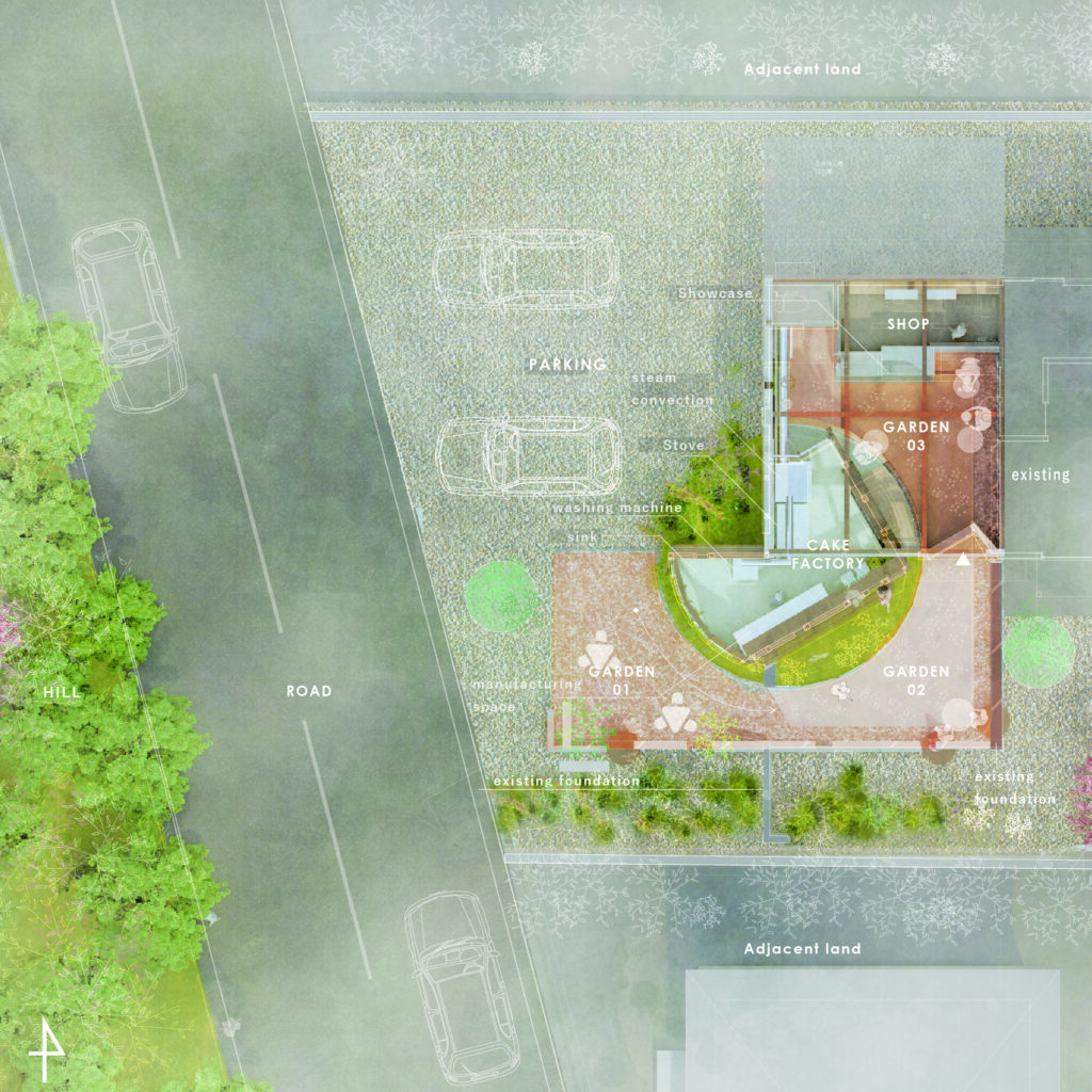 施主は、地元の⼈や観光客が気軽に⽴ち寄れる場を作ると共に、地域の住⺠に対して良好な労働環境を提供し、地元住⺠・観光者の双⽅にとって魅⼒のある場を求めていた。そこで私たちは製造所という従来裏⽅となる機能を建物の前⾯に配置し、わずかに増築することで新しいアイコンを創出した。